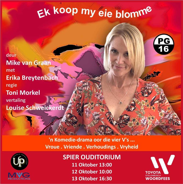 As a native Afrikaans speaker, Erika Breytenbach performed I CAN BUY MYSELF FLOWERS for the first time in Afrikaans at the Woordfees in Stellenbosch at the Spier Auditorium from 11-13 October. This provides the play with a longer life as it can now tour the Afrikaans festival circuit as well as small towns in either English or Afrikaans!